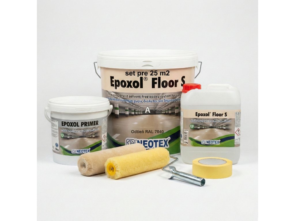 | Epoxol Floor S sivá (RAL 7040) | 1× 13,5 kg (A+B) | Hlavný epoxidový náter (2 vrstvy) |