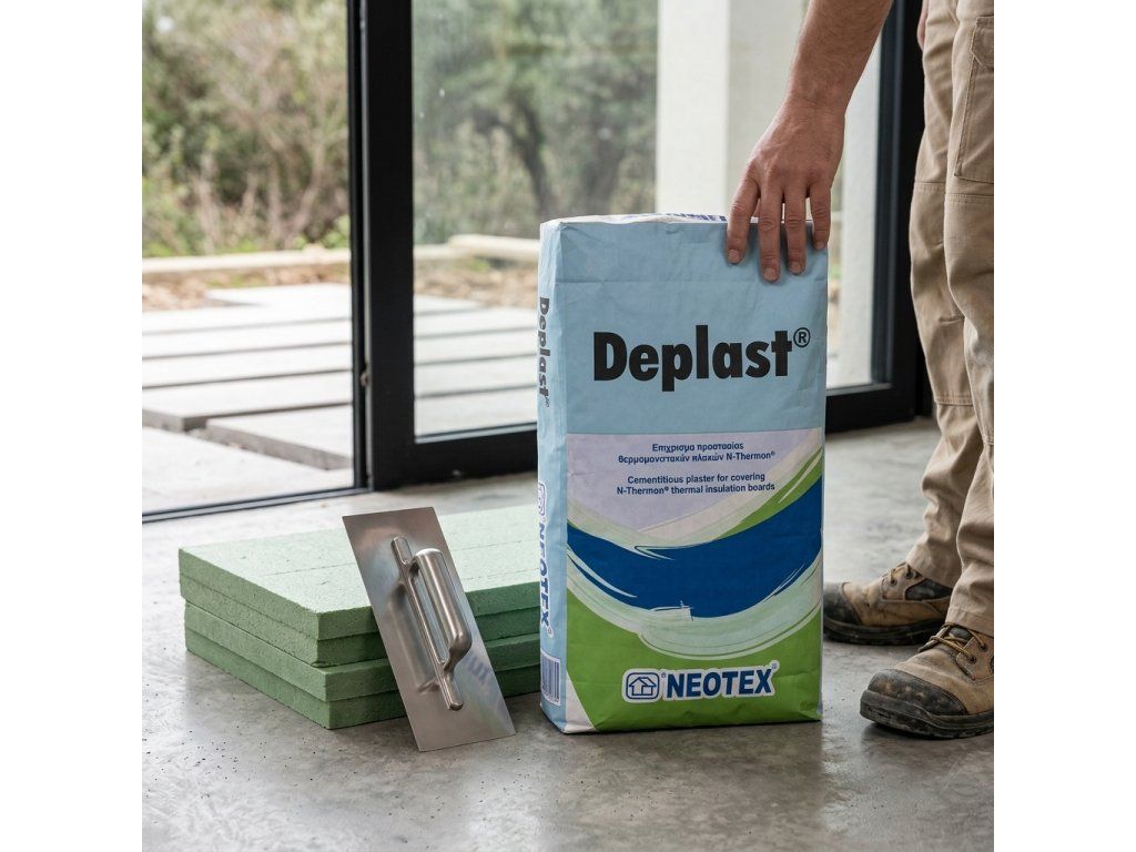 Ako súčasť systému N-Thermon® Po uplynutí 24 hodín od nanesenia kremenného základného náteru N-Thermon® Primer sa zubovým hladidlom nanesie prvá vrstva omietky Deplast® a zároveň sa hladkým hladidlom zapracuje alkalicky odolná sieťovina zo sklených vlákien N-Thermon® Mesh 90gr. Po 12 hodinách sa nanesie druhá vrstva omietky Deplast®. Dokončenie sa môže vykonať vyhladením povrchu omietacím hladidlom, akonáhle malta začne tuhnúť.