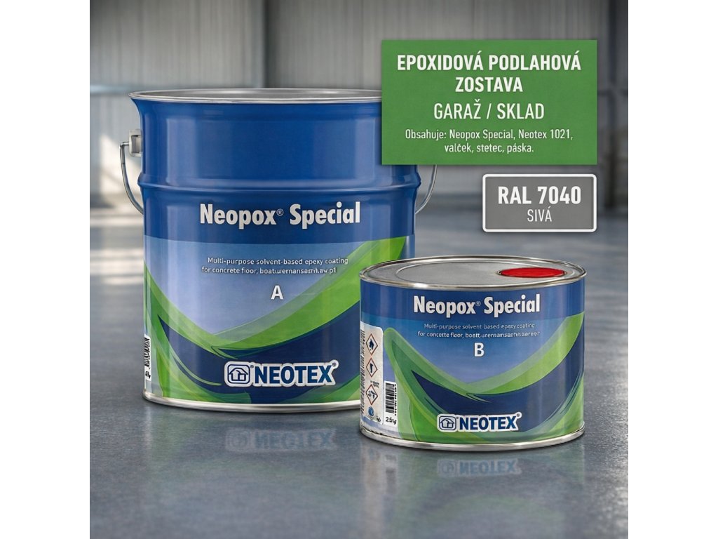 Kompletný set na profesionálnu epoxidovú podlahu v garáži alebo sklade do 100 m². Obsahuje 7× Neopox Špeciál (5 kg) v sivej farbe, rozpúšťadlo, valčeky a všetko potrebné náradie. Odolný proti olejom, chemikáliám a mechanickému namáhaniu. Aplikuj sám a ušetri tisíce eur.