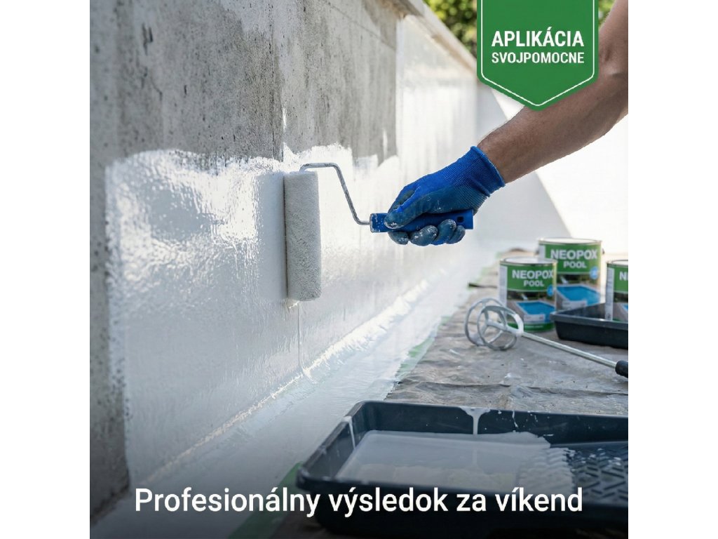 Príprava podkladu: 1-2 dni | Aplikácia Primer: 1 deň + 18 h schnutie | Neopox Pool (2 vrstvy): 2 dni. Celkovo počítaj s 4-5 dňami čistej práce. Po aplikácii ešte nechaj epoxid vytvrdnúť 7 dní pred napustením vody.