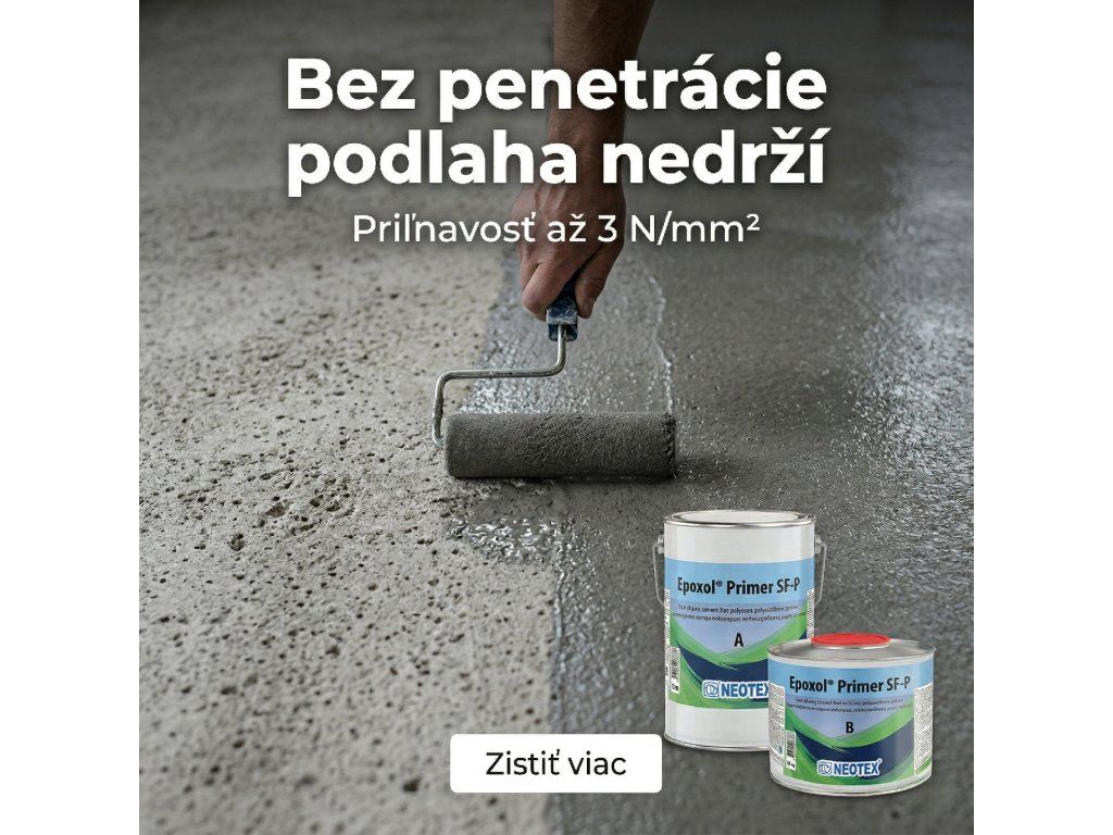 Plánuješ epoxidovú alebo polyuretánovú podlahu v garáži, dielni alebo sklade? Bez správnej penetrácie to celé môže skončiť odlúpnutou fólkou namiesto odolnej podlahy. Epoxol Primer SF-P je dvojzložkový epoxidový penetračný náter bez rozpúšťadiel (bez zápachu), ktorý vytvorí dokonalé spojenie medzi betónom a finálnym podlahovým systémom. Priľnavosť ≥3 N/mm² znamená, že podlaha drží tak pevne, že ju skôr rozbúraš, ako odlepíš.