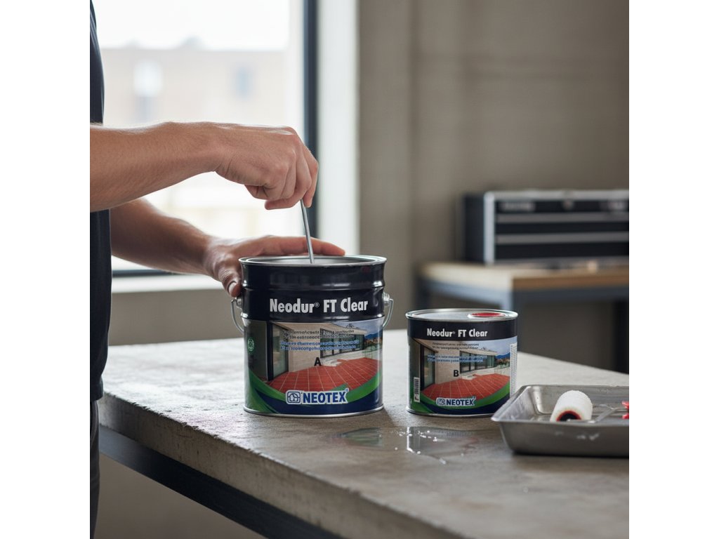 Krok 3: Prvá vrstva Neodur FT Clear. Zmieš zložky A a B v pomere 1:1. Miešaj el. miešadlom 2-3 minúty. Nanes valčekom alebo štetcom. Pracuj rýchlo – pot life je len 30 minút!