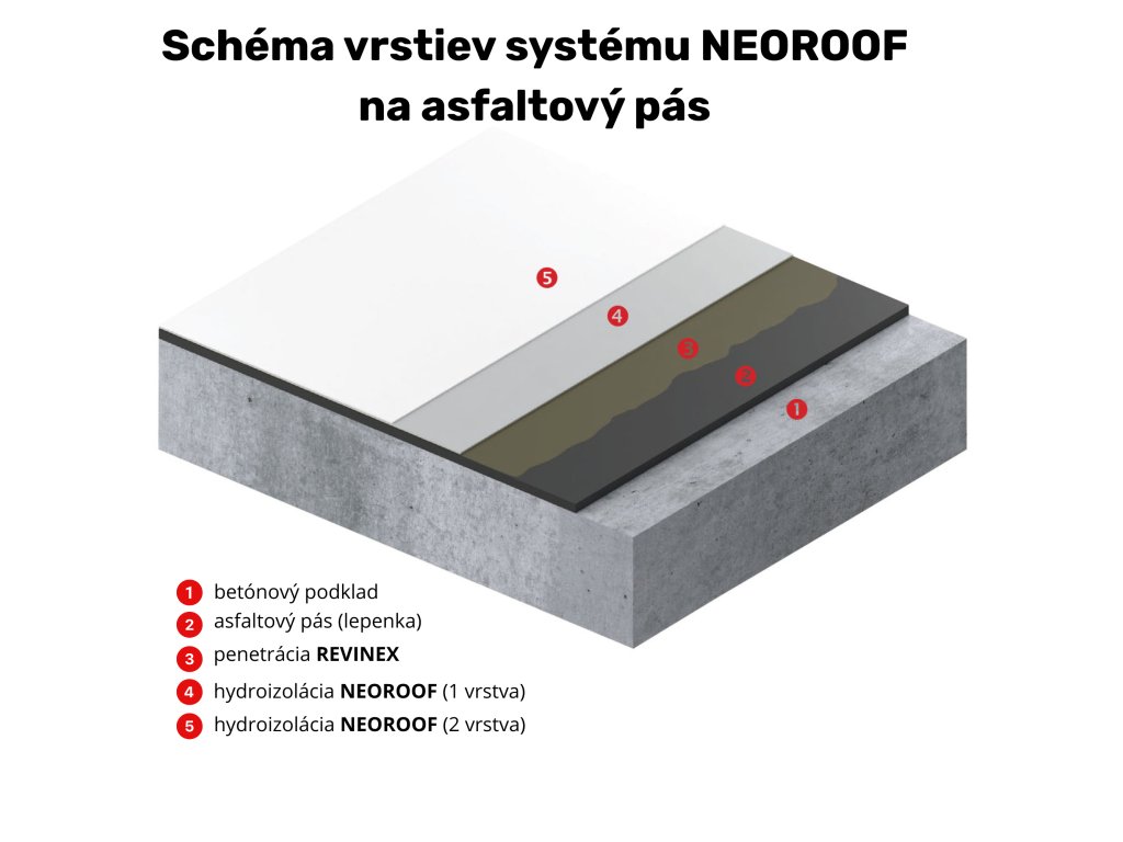 - Penetrácia na asfaltový pás – špeciálny primer, ktorý zlepší priľnavosť Neoroofu k starému pásu.