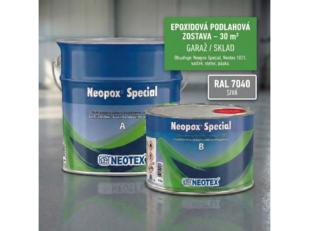 Kompletný set na profesionálnu epoxidovú podlahu v garáži alebo sklade do 30 m². Obsahuje 2× Neopox Špeciál (5 kg) v sivej farbe, rozpúšťadlo a volitelné náradie ako valčeky, pásky si môžete do setu pridať. Odolný proti olejom, chemikáliám a mechanickému namáhaniu. Aplikuj sám a ušetri tisíce eur.