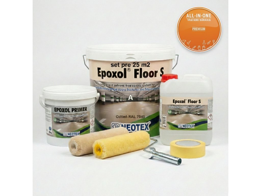 Set obsahuje všetko potrebné pre kompletný epoxidový náter podlahy: